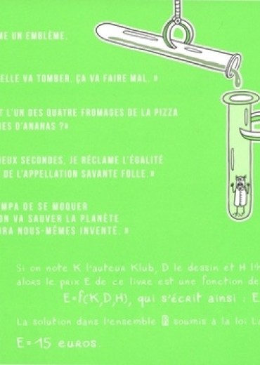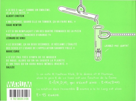 "Je dis E=mc2, comme un emblème, le n je le jette." Albert Einstein. "Ma théorie, quand elle va tomber. Ca va faire mal." Isaac Newton. "Et si on remplaçait l'un des quatre fromages de la pizza par quelques tranches d'ananas ?" Léonard de Vinci. "Le sexisme, ça va deux secondes, je réclame l'égalité des sexes et l'usage de l'appellation savante folle." Marie Curie. "C'est pas très sympa de se moquer de nous, alors qu'on va sauver la planète d'un truc qu'on aura nous-mêmes invente." Galilée.