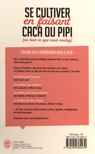 Qui a décrété que les toilettes devaient être un lieu sérieux, voire ennuyeux ? Dans la tradition des livres de cabinets, Se cultiver en faisant caca ou pipi (ou tout ce que vous voulez) a recueilli : Le meilleur de l'humour (juif, bien sûr) ; Le meilleur des citations (de Coluche à Marc Levy) ; Le meilleur des lettres célèbres (de Kafka à Marlene Dietrich) ; Le meilleur du New Yorker (les fameux dessins de presse, drôles et fins)... et bien d'autres informations utiles, légères, intelligentes et divertissantes. Installez-vous confortablement !