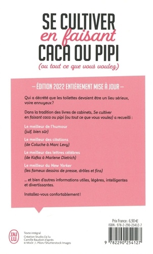 Qui a décrété que les toilettes devaient être un lieu sérieux, voire ennuyeux ? Dans la tradition des livres de cabinets, Se cultiver en faisant caca ou pipi (ou tout ce que vous voulez) a recueilli : Le meilleur de l'humour (juif, bien sûr) Le meilleur des citations (de Coluche à Marc Levy) Le meilleur des lettres célèbres (de Kafka à Marlene Dietrich) Le meilleur du New Yorker (les fameux dessins de presse, drôles et fins)... et bien d'autres informations utiles, légères, intelligentes et divertissantes. Installez-vous confortablement !