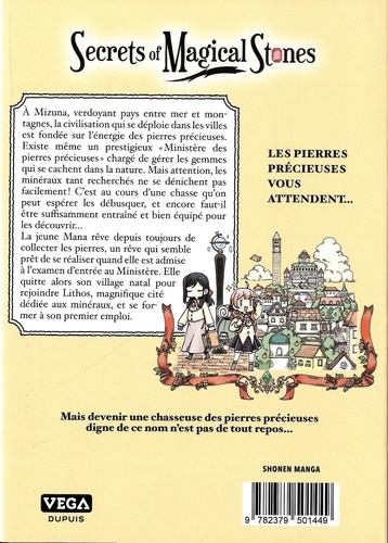 A Mizuna, verdoyant pays entre mer et montagnes, la civilisation qui se déploie dans les villes est fondée sur l'énergie des pierres précieuses. Existe même un prestigieux "Ministère des pierres précieuses" chargé de gérer les gemmes qui se cachent dans la nature. Mais attention, les minéraux tant recherchés ne se dénichent pas facilement ! C'est au cours d'une chasse qu'on peut espérer les débusquer, et encore faut-il être suffisamment entraîné et bien équipé pour les découvrir... La jeune Mana rêve depuis toujours de collecter les pierres, un rêve qui semble prêt de se réaliser quand elle est admise à l'examen d'entrée au Ministère. Elle quitte alors son village natal pour rejoindre Lithos, magnifique cité dédiée aux minéraux, et se former à son premier emploi. Mais devenir une chasseuse des pierres précieuses digne de ce nom n'est pas de tout repos...