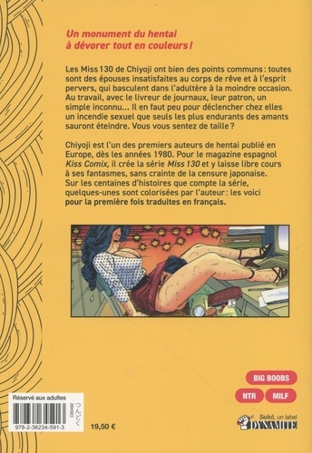 Un monument du hentai à dévorer tout en couleurs ! Les Miss 130 de Chiyoji ont bien des points communs : toutes sont des épouses insatisfaites au corps de rêve et à l'esprit pervers, qui basculent dans l'adultère à la moindre occasion. Au travail, avec le livreur de journaux, leur patron, un simple inconnu... Il en faut peu pour déclencher chez elles un incendie sexuel que seuls les plus endurants des amants sauront éteindre. Vous vous sentez de taille ? SEIKO CARDS : Retrouvez 2 cartes hentai à collectionner dans ce volume !