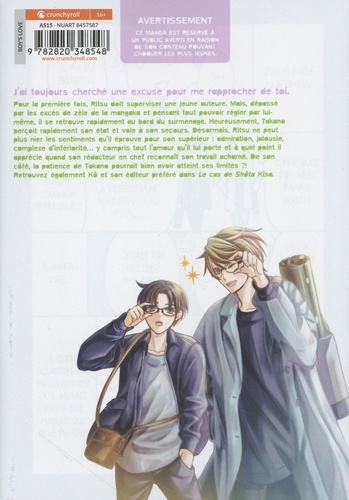 J'ai toujours cherché une excuse pour me rapprocher de toi. Pour la première fois, Ritsu doit superviser une jeune auteure. Mais, dépassé par les excès de zèle de la mangaka et pensant tout pouvoir régler par lui-même, il se retrouve rapidement au bord du surmenage. Heureusement, Takano perçoit rapidement son état et vole à son secours. Désormais, Ritsu ne peut plus nier les sentiments qu'il éprouve pour son supérieur : admiration, jalousie, complexe d'infériorité... y compris tout l'amour qu'il lui porte et à quel point il apprécie quand son rédacteur en chef reconnaît son travail acharné. De son côté, la patience de Takano pourrait bien avoir atteint ses limites ? ! Retrouvez également Kô et son éditeur préféré dans Le cas de Shôta Kisa.