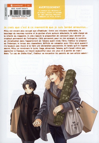 Je crois que c'est à ce moment-là que je suis tombé amoureux... Ritsu est encore plus occupé que d'habitude ! Entre ses missions éditoriales, le bouclage du nouveau numéro et la gestion d'une auteure débutante, le voilà chargé de la refonte du magazine. A cela s'ajoute la proposition de concourir pour devenir un employé permanent de l'entreprise. Côté personnel, pour ne rien arranger, le système de climatisation dans l'appartement de Takano ayant rendu l'âme, l'éditeur lui propose de l'héberger, le temps des réparations. Difficile de cohabiter avec l'être aimé quand il n'a toujours pas réussi à lui faire une déclaration passionnée. Et tandis qu'il le regarde dormir, Ritsu se remémore le lycée. Saga, désormais Takano, qu'il n'osait même pas approcher à l'époque, se trouve aujourd'hui sous ses yeux et à portée de main ! Dans "Le cas de Shôta Kisa", l'éditeur va rencontrer les parents de son artiste adoré !