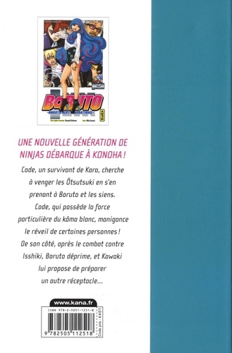 Code, un survivant de Kara, cherche à venger les Ôtsutsuki en s'en prenant à Boruto et les siens. Code, qui possède la force particulière du kâma blanc, manigance le réveil de certaines personnes ! De son côté, après le combat contre Isshiki, Boruto déprime, et Kawaki lui propose de préparer un autre réceptacle...
