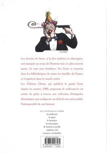 Les dessins de Serre, à la fois réalistes et ubuesques, sont marqués au sceau de l'humour noir. Le plus souvent muets, ils sont sans frontières. Ses livres se trouvent dans les bibliothèques de toutes les familles de France et s'exportent dans le monde entier. Les Editions Glénat, qui publient le grand Serre depuis les années 1980, proposent de redécouvrir cet artiste de génie à travers une collection d'intégrales thématiques qui soulignent, au-delà de son universalité, l'intemporalité de son humour.