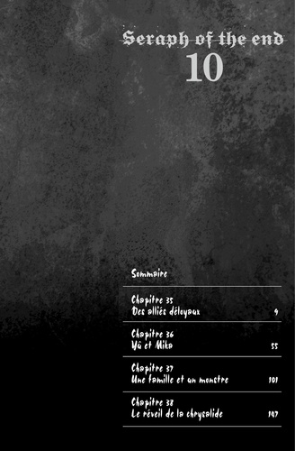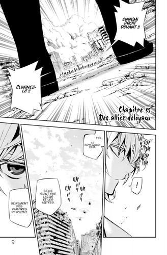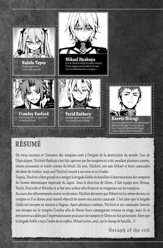 Vampires, ma soif de vengeance est bien plus forte que votre soif de sang ! Alors que la brigade Gekki envoyée en première ligne est en train de se replier, elle tombe sur Mikael venu seul pour aider Yûichirô, et un combat s'engage. Mais Shinoa et camarades sont émus par l'ardeur de Mikael, qui, malgré sa blessur, pense avant tout à son ami. Ils vont agir de façon inattendue…!!