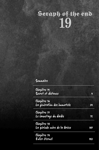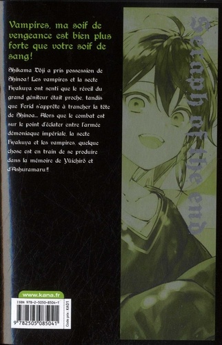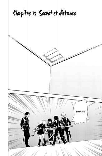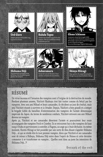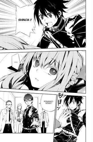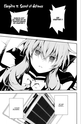 Shikama Dôji a pris possession de Shinoa ! Les vampires et la secte Hyakuya ont senti que le réveil du grand géniteur était proche, tandis que Ferid s'apprête à trancher la tête de Shinoa... Alors que le combat est sur le point d'éclater entre l'armée démoniaque impériale, la secte Hyakuya et les vampires, quelque chose est en train de se produire dans la mémoire de Yûchirô et d'Ashuramaru !!