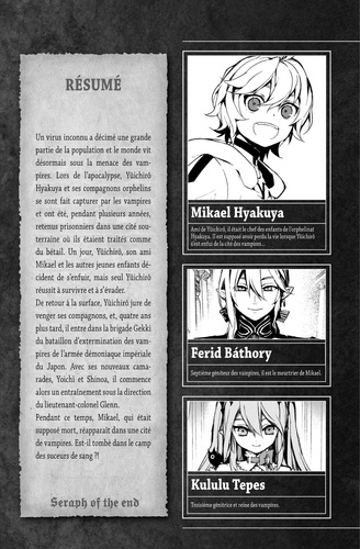 Alors qu'un virus a décimé une partie de l'humanité, les vampires ont pris le pouvoir ! Ils élèvent les enfants comme du bétail pour se repaître de leur sang. Ils n'hésitent pas à les tuer. Afin de venger la mort de ses amis, Yûichiro s'enrôle dans un bataillon d'extermination de vampires. Il sera aidé par l'intrépide Shinoa et par son arme possédée par un démon mais qui se dressera devant lui ?!