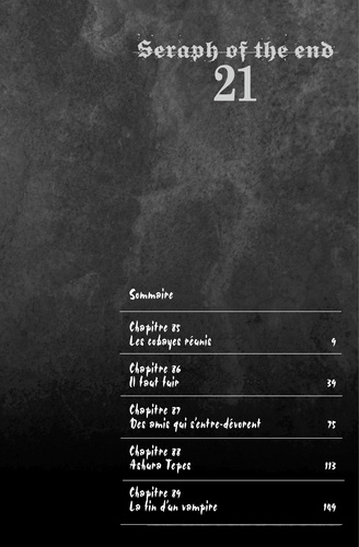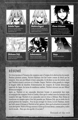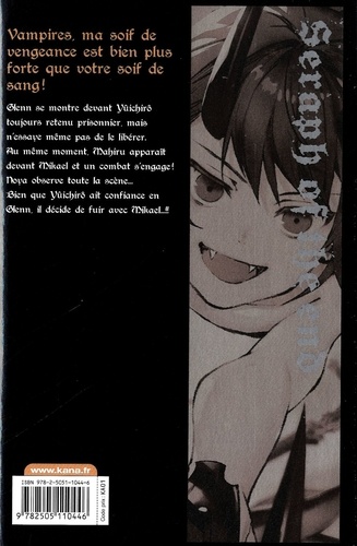 Vampires, ma soif de vengeance est bien plus forte que votre soif de sang ! Glenn se montre devant Yûichirô toujours retenu prisonnier, mais n'essaye même pas de le libérer ? Au même moment, Mahiru apparaît devant Mikael et un combat s'engage ! Noya observe toute la scène... Bien que Yûichirô ait confiance en Glenn, il décide de fuir avec Mikael !!