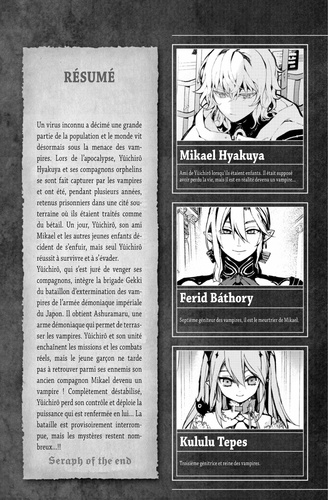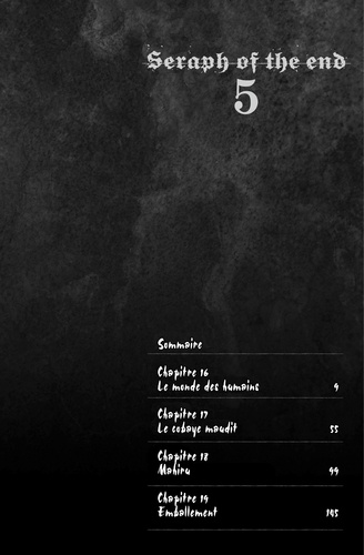 Vampire, ma soif de vengeance est bien plus forte que votre soif de sang ! La famille Fiiragi fait subir un sévère interrogatoire à Yûichirô ira qui s'est à peine remis de son dernier combat... Face à l'arrogance des Fiiiragi, Yûichirô prend à nouveau conscience de l'importance de ses camarades. Afin de sauver Mikael et de protéger ses compagnons, Yûichirô va commencer un entraînement pour renforcer son arme démoniaque ! !
