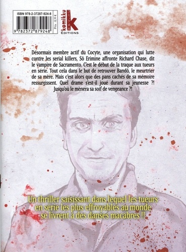 Le monde horrifique des tueurs en série ! NOKUTO KOIKE fait son retour chez Komikku ! Désormais membre actif du Cocyte, une organisation qui lutte contre les serial killers, Sô Erimine affronte Richard Chase, dit le vampire de Sacramento. C'est le début de la traque aux tueurs en série. Tout cela dans le but de retrouver Bandô, le meurtrier de sa mère. Mais c'est alors que des pans cachés de sa mémoire ressurgissent. Quel drame s'est-il joué durant sa jeunesse ? ! Jusqu'où le mènera sa soif de vengeance ? ! Un thriller sarsissant dans lequel les tueurs en serie les plus effroyables au monde se livrent à des danses macabres !!