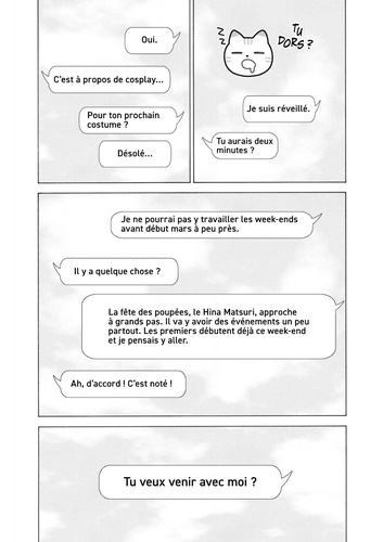Leur premier Comiket est un franc succès ! Enfin, peut-être pas tout à fait... Cosplayée en Haniel, Marine déclenche un enthousiasme comme on n'en avait jamais vu au Comiket. Elle finit même par attirer l'attention de l'auteur de "Mandat Céleste"... ce qui contribue d'autant plus à faire parler d'elle. Mais l'air sombre de Gojô, au retour de la convention, jette un froid dans la relation entre les deux adolescents. Alors qu'ils sont partis ensemble voir une exposition de poupées Hina, une jeune fille du passé de Gojô ressurgit devant lui...