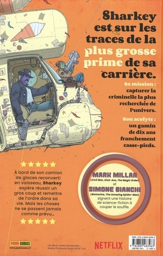 Pour cette nouvelle série, Mark Millar est accompagné par le dessinateur italien Simone Bianchi (Wolverine, Astonishing X-Men, Spider-Man : Les Santerians). Après The Magic Order et Prodigy, découvrez la nouvelle collaboration de Mark Millar (Civil War) et Netflix ! Sharkey est un chasseur de primes, parcourant la galaxie dans son camion de glaces reconverti. Avec son nouveau partenaire âgé de dix ans, il se lance dans l'aventure la plus dangereuse de sa carrière.