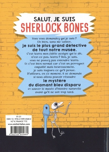 Salut, je suis des Sherlock Bones. Vous vous demandez qui je suis ? Eh bien, sans me vanter, je suis le plus grand détective de tout notre musée. C'est Watts mon fidèle acolyte qui le dit, n'est ce pas, Watts ? Bon, je sais, vous ne pouvez pas entendre Watts. Et c'est bien normal car c'est un perroquet empaillé mais heureusement, je sais toujours ce qu'il pense. D'ailleurs, en ce moment, il se demande si nous allons pouvoir résoudre le mystère du diamant bleu disparu et sauver le musée d'histoire naturelle avant qu'il ne soit trop tard ?
