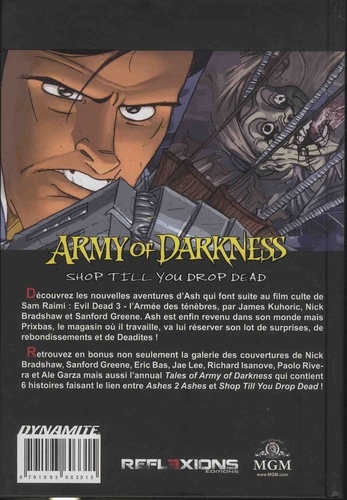 Découvrez les nouvelles aventures d'Ash qui font suite au film culte de Sam Raimi : Evil Dead 3 - l'Armée des ténèbres, par James Kuhoric, Nick Bradshaw et Sanford Greene. Ash est enfin revenu dans son monde mais Prixbas, le magasin où il travaille, va lui réserver son lot de surprises, de rebondissements et de Deadites ! Retrouvez en bonus non seulement la galerie des couvertures de Nick Bradshaw, Sanford Greene, Eric Bas, Jae Lee, Richard Isanove, Paolo Rivera et Ale Garza mais aussi l'annual Tales of Army of Darkness qui contient 6 histoires faisant le lien entre Ashes 2 Ashes et Shop Till You Drop Dead !