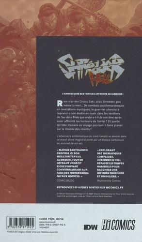 Mateus Santolouco au sommet de son art ! Rien n'arrête Oroku Saki, pas même la mort... Ainsi commence son voyage vers l'au-delà. Et cette nouvelle aventure est bien loin d'une Divine Comédie ! Que restera-t-il de l'âme de Shredder après avoir affronté les horreurs de l'Enfer ? S'enfonçant dans les ténèbres, l'ennemi juré des Tortues sera-t-il capable de repousser l'assaut de forces démoniaques ? " Explorant des thématiques complexes, Shredder in Hell dépasse les tropes habituels du comics pour raconter une histoire profonde et singulière. " Multiversity Comics " Mateus Santolouco a prouvé qu'il pouvait se mesurer aux meilleurs dessinateurs de l'industrie du comics. Shredder in Hell confirme cette réputation en offrant aux lecteurs une expérience captivante du début à la fin. " Comics Bulletin