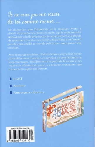 Avec Si nous étions adultes... , Takako Shimura signe une oeuvre particulièrement moderne, en scrutant de près l'intimité de ses personnages. Tiraillées entre le poids de la société et les mauvaises décisions du passé, ses héroïnes trouveront sans mal un écho auprès des lecteurs. Ne supportant plus l'hypocrisie de la situation, Ayano a décidé de prendre les choses en main. Après avoir consulté une avocate afin de préparer un éventuel divorce, elle décide de retourner vivre chez ses parents. Mais Wataru ne l'entend pas de cette oreille et semble prêt à tout pour sauver leur mariage...