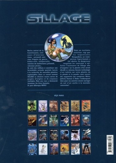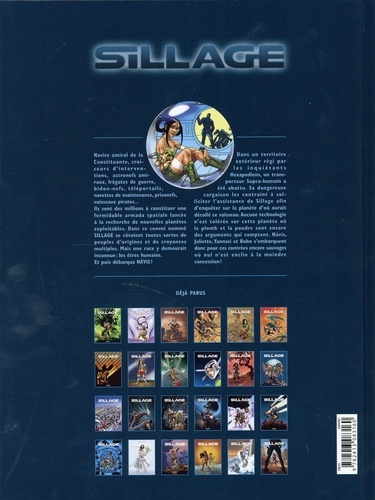 Navire amiral de la Constituante, croiseurs d'interventions, astronefs amiraux, frégates de guerre, bidon-nefs, téléportails, navettes de maintenance, prisonefs, vaisseaux pirates... Ils sent des millions à constituer une formidable armada spatiale lancée à la recherche de nouvelles planètes exploitables. Dans ce convoi nommé SILLAGE se côtoient toutes sortes de peuples d'origines et de croyances multiples. Mais une race y demeurait inconnue : les êtres humains. Et puis débarqua Nävis ! Dans un territoire extérieur régi par les inquiétants Hexapodiens, un transporteur Supra-humain a été abattu. Sa dangereuse cargaison les contraint à solliciter l'assistance de Sillage afin d'enquêter sur la planète d'où aurait décollé ce vaisseau. Aucune technologie n'est tolérée sur cette planète où le plomb et la poudre sont encore des arguments qui comptent. Nävis, Juliette, Yannseï et Bobo s'embarquent donc pour ces contrées encore sauvages où nul n'est enclin à la moindre concession !