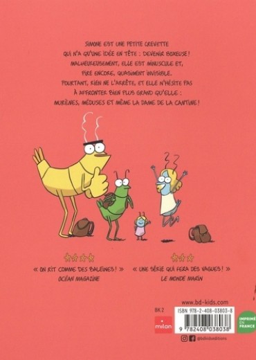 Simone est une crevette pas tout à fait comme les autres : déjà, elle est transparente, ce qui n'est franchement pas pratique. Mais en plus, elle adore la bagarre, la castagne, les combats, le grabuge... bref, l'action ! Ca en fait une petite fille tout à fait spéciale, et pas toujours très adaptée aux attentes de ses parents ou de ses professeurs. Heureusement, dans la vie de Simone, il y a aussi les copains. Ensemble, ils sèchent les cours de yoga maritime, vont voir des matches de boxes en cachette, oublient de réviser leurs cours de survie pour aller plutôt observer les raies mantas. Car autour de l'école et de la maison, le monde de Simone, c'est l'océan, son immensité mystérieuse et ses dangers périlleux ! Un terrain de jeu beaucoup plus rigolo pour des enfants crevettes en quête de bêtises et d'aventures !