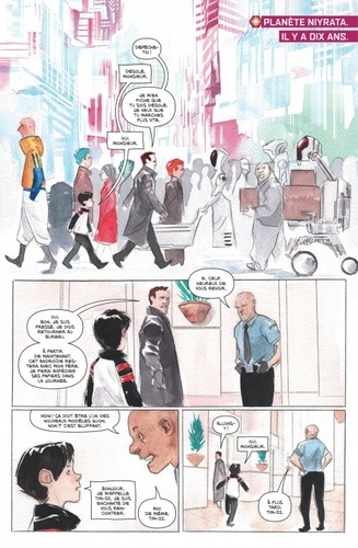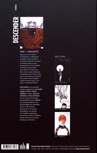 Depuis qu'ils ont rejoint le Programme, la Résistance robotique menée par Psius, le capitaine Telsa et le Dr Quon se posent de plus en plus de questions sur les véritables motivations qui animent leurs hôtes. Et à juste titre... Pour mener le genre robotique à la grandeur qu'il mérite, Psius oeuvre en secret pour construire son armée et ainsi éradiquer l'espèce humaine avec, à ses côtés, l'inquiétant TIM-22. Descender est la première création conjointe de Jeff Lemire (Sweet Tooth, Green Arrow) et Dustin nguyen (Batman, Little Gotham). Sur les traces de l'héritage philosophique d'Isaac Asimov (Le Cycle des Robots) et de Philip K Dick (Les Androïdes rêvent-ils de moutons électriques ?), les auteurs développent une odyssée S-F sensible et grandiose, empruntant autant au bestiaire de Star Wars qu'aux romans initiatiques d'aventure.