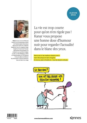 La vie est trop courte pour qu'on n'en rigole pas ! Kanar vous propose une bonne dose d'humour noir pour regarder l'actualité dans le blanc des yeux. Retrouvez ici les meilleurs dessins parus dans Moustique et dans Imagine. En bonus, plein d'inédits et... tous les dessins refusés.