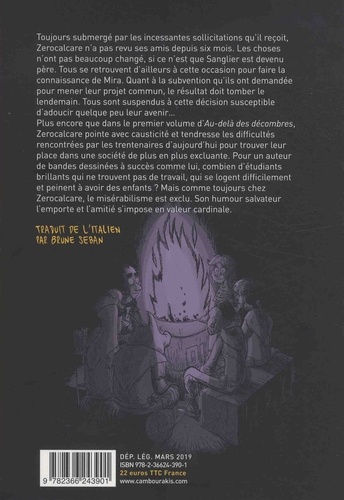 Toujours submergé par les incessantes sollicitations qu'il reçoit, Zerocalcare n'a pas revu ses amis depuis six mois. Les choses n'ont pas beaucoup changé, si ce n'est que Sanglier est devenu père. Tous se retrouvent d'ailleurs à cette occasion pour faire la connaissance de Mira. Quant à la subvention qu'ils ont demandée pour mener leur projet commun ; le résultat doit tomber le lendemain. Tous sont suspendus à cette décision susceptible d'adoucir quelque peu leur avenir... Plus encore que dans le premier volume d'Au-delà des décombres, Zerocalcare pointe avec causticité et tendresse les difficultés rencontrées par les trentenaires d'aujourd'hui pour trouver leur place dans une société de plus en plus excluante. Pour un auteur de bandes dessinées à succès comte lui, combien d'étudiants brillants qui ne trouvent pas de travail ; qui se logent difficilement et peinent à avoir des enfants.? Mais comme toujours chez Zerocalcare, le misérabilisme est exclu. Son humour salvateur l'emporte et l'amitié s'impose en valeur cardinale.