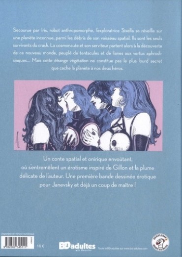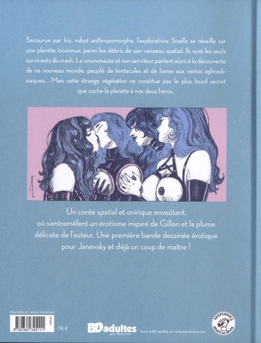 Un conte spatial et onirique envoûtant, où s'entremêlent un érotisme inspiré de Gillon et la plume délicate de l'auteur. Une première bande dessinée érotique pour Janevsky et déjà un coup de maître ! Secourue par Iris, robot anthropomorphe, l'exploratrice Sixella se réveille sur une planète inconnue, parmi les débris de son vaisseau spatial. Ils sont les seuls survivants du crash. La cosmonaute et son serviteur partent alors à la découverte de ce nouveau monde, peuplé de tentacules et de lianes aux vertus aphrodi siaques... Mais cette étrange végétation ne constitue pas le plus lourd secret que cache la planète à nos deux héros. Un conte spatial et onirique envoûtant, où s'entremêlent un érotisme inspiré de Gillon et la plume délicate de l'auteur. Une première bande dessinée érotique pour Janevsky et déjà un coup de maître !