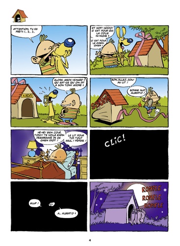 Tony c'est le petit garçon. Alberto c'est son chien. Ils sont copains comme cochons. Tony adore péter et roter. Alberto adore péter et roter aussi. Il faut dire qu'Alberto est un chien intelligent et qu'il possède autant de jugeote que son pote. Ensemble, ils n'arrêtent pas d'enchaîner les bêtises plus débiles les unes que les autres. Qu'ils soient en vacances sous leur tente ou à la mer, à la piscine ou en train de jouer au foot, ils déclenchent des catastrophes... Leurs formidables concours de pets sous la tente nécessitent même l'intervention du SAMU ! Bref, ils ne font pas dans la dentelle et nous font bien marrer. Tony & Alberto, c'est Boule & Bill qui auraient rencontré Beavis & Butthead. C'est trash à souhait, et ça désacralise le mythe trop gentil du petit garçon et de son petit chien. Ces deux anti-héros nés sous la fine plume de Dab's, nous entraînent vers des aventures désopilantes et ne devraient pas tarder à rencontrer le succès fracassant qu'ils méritent.