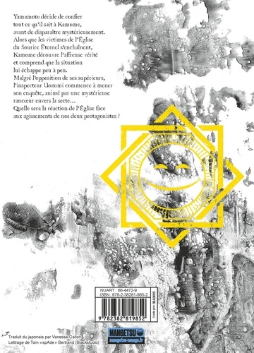 Yamamoto décide de confier tout ce qu'il sait à Kamome, avant de disparaître mystérieusement. Alors que les victimes de l'Eglise du Sourire Eternel s'enchaînent, Kamome découvre l'affreuse vérité et comprend que la situation lui échappe peu à peu. Malgré l'opposition de ses supérieurs, l'inspecteur Uozumi commence à mener son enquête, animé par une mystérieuse rancoeur envers la secte... Quelle sera la réaction de l'Eglise face aux agissements de nos deux protagonistes ? Publiée chez Nihon Bungeisha, Smile ! est une oeuvre qui plonge le lecteur dans les ténèbres d'un culte inquiétant. Hattori Mitei vous entraîne dans un thriller des plus haletants et un drame psychologique inoubliable. "Un thriller psychologique captivant". Francetvinfo. fr "Un suspense totalement addictif". Le Point Pop