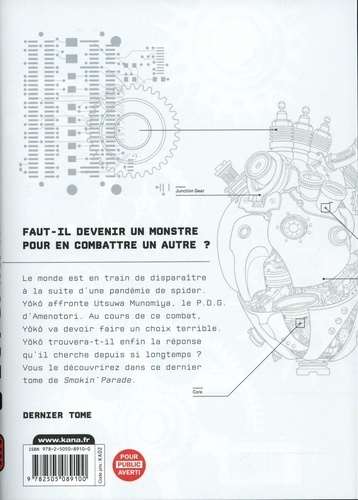 Le monde est en train de disparaitre à la suite d'une pandémie de spider. Yôkô affronte Utsuwa Munomiga, le P.D.G. d'Amenotori. Au cours de ce combat. Yôkô va devoir faire un choix terrible. Yôkô trouvera-t-il enfin la réponse qu'il cherche depuis si longtemps ? Vous le découvrirez dans ce dernier tome de Smokin'Parade.