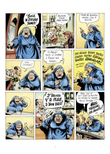 Soeur Marie-Thérèse des Batignolles est une bonne soeur au caractère bien trempé (dans l'alcool). Elle fume de l'herbe, aime faire des galipettes et n'a pas sa langue, ni son direct du droit d'ailleurs, dans sa poche. La justice divine, elle l'applique à sa manière, et c'est souvent à coups de Rangers dans les dents, mais toujours dans le respect de Jésus, le jardinier portugais du couvent.
