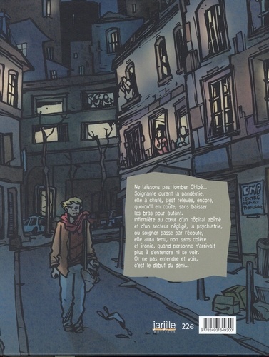 Ne laissons pas tomber Chloé... Soignante durant la pandémie, elle a chuté, s'est relevée, encore, quoiqu'il en coûte, sans baisser tes bras pour autant. Infirmière au coeur d'un hôpital abîmé et d'un secteur négligé, la psychiatrie, où soigner passe par l'écoute, elle aura tenu, non sans colère el ironie, quand personne n'arrivait plus à s'entendre ni se voir. Or ne pas entendre et voir, c'est le début du déni...