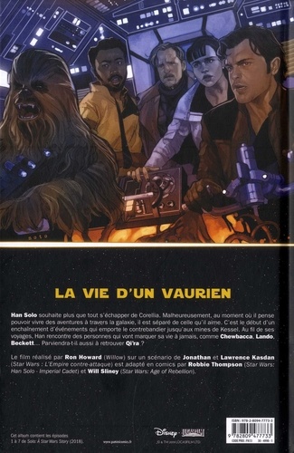 La vie d'un vaurien. Han Solo souhaite plus que tout s'échapper de Corellia. Malheureusement, au moment où il pense pouvoir vivre des aventures à travers la galaxie, il est séparé de celle qu'il aime. C'est le début d'un enchaînement d'événements qui emporte le contrebandier jusqu'aux mines de Kessel. Au fil de ses voyages, Han rencontre des personnes qui vont marquer sa vie à jamais, comme Chewbacca, Lando, Beckett... Parviendra-t-il. aussi à retrouver Qi'ra ? Le film réalisé par Ron Howard (Willow) sur un scénario de Jonathan et Lawrence Kasdan (Star Wars : L'Empire contre-attaque) est adapté en comics par Robbie Thompson (Star Wars : Han Solo - Imperial Cadet) et Will Sliney (Star Wars : Age of Rebellion). Cet album contient les épisodes 1 à 7 de Solo : a Star Wars Story (2018).