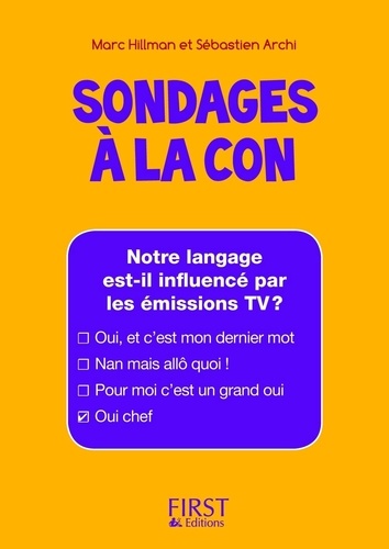 Que pensez-vous des sondages ? ? Ils ont opinion sur rue ? IFOP pas les mettre à toutes l'IPSOS ? C'est réservé surtout aux gens qui sondages mûrs ? Ce sont des histoires de totaux Iriez-vous passer vos vacances en Irlande ? ? Oui un peu d'Eire ça fait Dublin ? C'est sur qu'on doit y vivre des journées belles, fastes ? On IRA certainement un de ces jours Notre langage est-il influencé par les émissions TV ? ? Oui, c'est mon dernier mot ? Nan mais Allo quoi ? Pour moi c'est un grand oui ? Oui chef ? C'est que du bonheur ! Êtes-vous plutôt bas ou collants ? ? Nylon, ni l'autre ? Les collants ! et y'a pas débat ? Les bas ! ça va de soies ? L'un ou l'autre, ça me fait une belle jambe Tous ces sondages sont bourrés de jeux de mots : fous rires garantis !