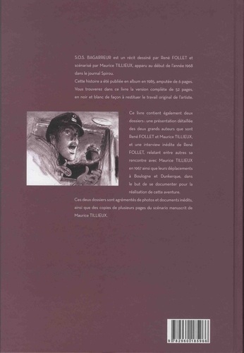 S.O.S. BAGARREUR est un récit dessiné par René FOLLET et scénarisé par Maurice TILLIEUX, apparu au début de l'année 1968 dans le journal Spirou. Cette histoire a été publiée en album en 1985, amputée de 6 pages. Vous trouverez dans ce livre la version complète de 52 pages, en noir et blanc de façon à restituer le travail original de l'artiste. Ce livre contient également deux dossiers : une présentation détaillée des deux grands auteurs que sont René FOLLET et Maurice TILLIEUX, et une interview inédite de René FOLLET, relatant entre autres sa rencontre avec Maurice TILLIEUX en 1967 ainsi que leurs déplacements à Boulogne et Dunkerque, dans le but de se documenter pour la réalisation de cette aventure. Ces deux dossiers sont agrémentés de photos et documents inédits, ainsi que des copies de plusieurs pages du scénario manuscrit de Maurice TILLIEUX.