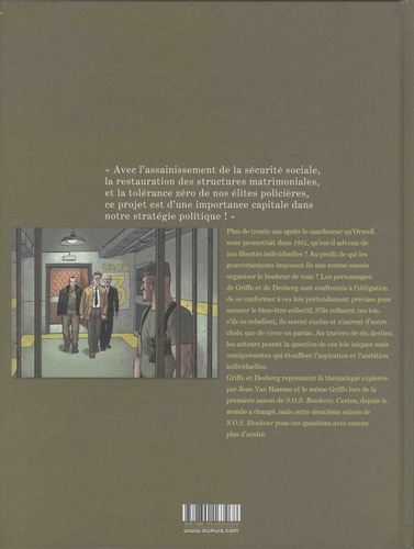 En 1988 paraissait, dans le tout neuf label "Aire Libre", le premier tome de "S.O.S. bonheur", une suite de fables dystopiques qui mettaient à nu les angoisses de la société d'alors. Presque trente ans plus tard, nos craintes ont-elles changé ? C'est la question que pose aujourd'hui Stephen Desberg avec cette nouvelle saison, à la fois hommage et mise à jour de l'oeuvre initiale de Jean Van Hamme - qui en signe d'ailleurs la préface. Pour répondre à cette question, Stephen Desberg dessine dans ce triptyque les contours d'un monde régi par les penseurs d'extrême droite, un univers dominé par l'argent, les valeurs morales réactionnaires, la figure du mâle ou encore la préférence nationale.
