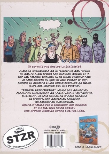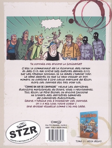 La ricane s'invite dans les urnes pour les prochaines municipales ! Lassé de la bureaucratie des politiques et du mépris des citadins, Riton se laisse embarquer dans les conneries de la Sotizerie et décide de se présenter aux prochaines élections municipales. Bon, il était bien cuit ce soir-là, mais comme tout le 6 roses, le bar du Bourg, s'en souvient, il va falloir assurer maintenant. Assisté de Kévin, le jeune du Bourg qui passe son temps à faire des tonneaux en C15, Cindy, belle plante du village et fille d'agri, Carotte, Hervé, Sacoche, la père Bichet et même la Momone, l'ancienne qui rouspète sur tout le monde, Riton est prêt à battre à plate couture l'un des derniers partis politiques qui chasse sur le terrain de la ruralité : le parti écolo... Auteurs : Scénariste et dessinateur, Jack Domon est spécialisé depuis plus de 10 ans dans la BD d'humour. Saxophoniste du groupe Skarface, il plonge aussi dans l'imagerie rock'n roll grâce à une double page réalisée pour le Rock'n'Folk de Philippe Manoeuvre. Il développe ensuite des collaborations dans l'édition, la presse... Qui sont Titi et Riton aka les Daft Punk du Bourg ? Derrière ces 2 noms se cachent les fondateurs de La Sotizerie ! Il suffit d'aller voir sur les réseaux sociaux et de constater qu'il s'agit de LA communauté représentant la France rurale et la vie au quotidien dans ces villages trop souvent oubliés. S'y mêlent humour décalé, cascades abracadabrantesques, blague potache et ricanante. Le parfait cocktail pour tous les amateurs d'apéro, d'humour noir, de belles cylindrées, et autres sottises.