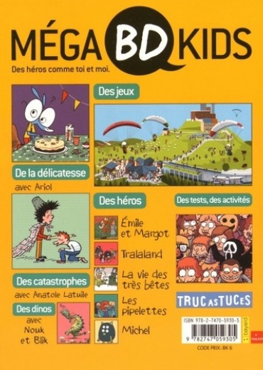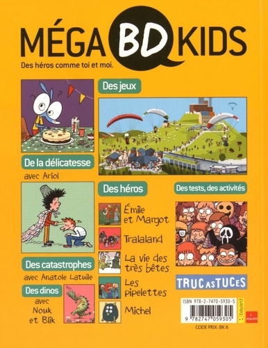 Prêt de deux cents pages de BD et de gags pour travailler ses zygomatiques, le tout accompagné d'activités, de jeux et de tests survitaminés... Vous êtes partant ? Après la parution de trois premiers tomes, voici le quatrième Méga BD Kids, assemblant des séries BD Kids sur le thème de l'humour... pour encore plus de détente et de rire ! Dans ce tome 4, retrouvez la malice "d'Avni", l'humour absurde avec "Michel", les commérages des "Pipelettes", les contrées absurdes et l'univers décalé de "Tralaland"... Mais ce "Spécial Humour", c'est aussi les planches hilarantes de "La cantoche", "Helmout", "Toto", "Anatole Latuile", "Nouk et Blik"... Et la liste ne s'arrête pas là ! Rire, il n'y a rien de meilleur pour la santé ! Alors contre la sinistrose, réalisez l'acte civique par excellence : prenez votre méga BD kids Humour pour vous immerger le coeur au chaud en compagnie de vos héros préférés...