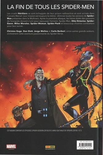 Il aura fallu le courage et la force d'un grand nombre de versions de Spider-Man pour venir à bout des Héritiers. Mais voilà que les vilains se sont échappés de leur planète-prison, prêts à prendre leur revanche sur tous ceux qui ont un jour porté le costume de Spider-Man. C'est ainsi que commence Spider-Geddon, qui va réunir Peter Parker, le Spider-Man Supérieur, Spider-Gwen, Miles Morales, Spider-Woman, mais aussi Spider-Punk et le Spider-Man du jeu vidéo PS4 ! De nouvelles versions font même leur apparition, comme dans cet univers où c'est Tante May qui porte le costume du Tisseur ! En 2014, Dan Slott a pimenté son populaire passage sur la série Amazing Spider-Man par un crossover d'un nouveau genre, complètement déjanté, réunissant d'innombrables versions de Spider-Man venues d'univers parallèles. Le succès a été au rendez-vous. Il était temps de revisiter cet événement ! Ce n'est que le début : une série régulière a été lancée, nous l'avons découverte dans le 100% MARVEL publié en septembre 2020.