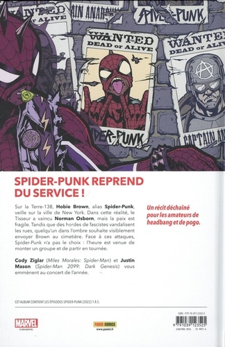 Spider-Punk se lance dans ses propres aventures ! Hobie Brown est le Spider-Man anarchiste de la Terre-138, et il défend la justice une hache à la main avec sa bande de héros. Mais face au Maître de Corvée, Hobie et ses amis vont-ils pouvoir réellement dire : "No future" ? L'une des stars du dessin animé Spider-Man : Across the Spider-Verse a sa propre mini-série ! La version anar de Spider-Man est certainement l'un des personnages phares du phénomène ciné de l'année 2023 et en attendant la suite dans les salles obscures, nous vous proposons de faire plus ample connaissance avec ce Spider-Man, politiquement très engagé, dans une saga complète !