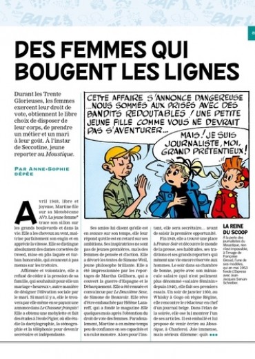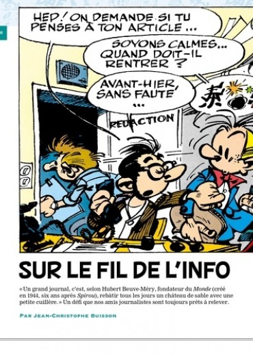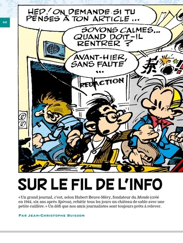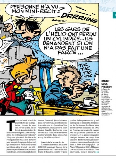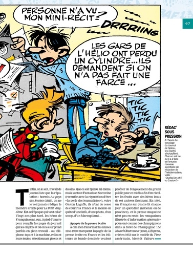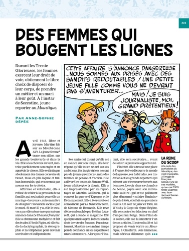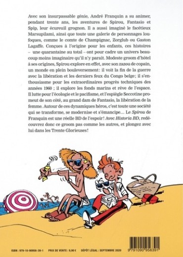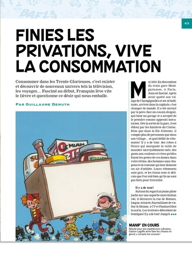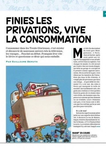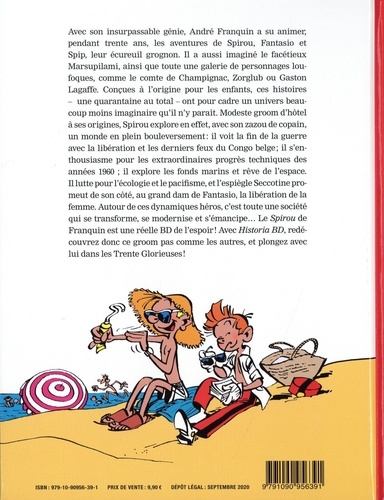 Prenez l'ascenseur de l'Histoire avec Spirou et pressez le bouton des Trente Glorieuses ! L'histoire du journal Spirou pendant la guerre, les débuts du Spirou de Franquin, un entretien avec Emile Bravo, un chapitre sur les voitures de Franquin, un autre sur les femmes qui bougent les lignes, sans oublier les parties sur la consommation de masse et la publicité dans les années 1960 !