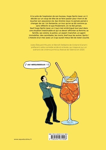 A la suite de l'explosion de son bureau, Hugo Spritz (avec uni) décide sur un coup de tête de se faire passer pour mort et de toucher sonassurance vie. Qui d'entre nous n'a jamais pensé à changer de vie ! Un fantasme, un truc qu'on se dit comme ça, sans réfléchir et que finalement, on ne faitjamais. Sauf Hugo Spritz (avec un i) qui s'est embringué tout seul dans unesituation inextricable et qui va devoir affronter sa femme, sa famille, sesvoisins, la police, un expert manchot, un agent immobilier, des cannibales, lesmorts, bref tous les autres. Spritz ! l'histoire d'un mec (avec un i) qui auraitmieux fait de rester couché. Jules-Edouard Moustic et Benoit Delépinede Groland (Canal +) préfacent cette comédie acide et enlevée, qui s'appuie surun scénario de cinéma primé au festival de Valence en 2020.