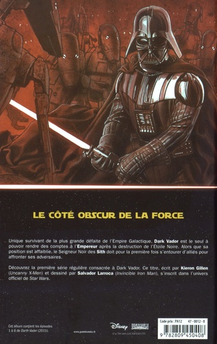 Unique survivant de la plus grande défaite de l'Empire Galactique, Dark Vador est le seul à pouvoir rendre des comptes à l'Empereur après la destruction de l'Etoile Noire. Alors que sa position est affaiblie, le Seigneur Noir des Sith doit pour la première fois s'entourer d'alliés pour affronter ses adversaires. Découvrez la première série régulière consacrée à. Dark Vador. Ce titre écrit par Kieron Gillen (Uncanny X-Men) et dessiné par Salvador Larroca (Invincible Iron Man), s'inscrit dans l'univers officiel de Star Wars.
