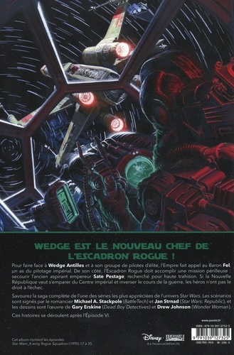 Wedge est le nouveau chef de l'escadron Rogue ! Pour faire face à Wedge Antilles et à son groupe de pilotes d'élite, l'Empire fait appel au Baron Fel, un as du pilotage impérial. De son côté, l'Escadron Rogue doit accomplir une mission périlleuse : secourir l'ancien aspirant empereur Sate Pestage, recherché pour haute trahison. Si la Nouvelle République veut s'emparer du Centre impérial et inverser le cours de la guerre, les héros n'ont pas le droit à l'échec. Savourez la saga complete de l'une des séries les plus appréciées de l'univers Star Wars. Les scénarios sont signés par le romancier Michael A. Stackpole (BattleTech)et Jan Strnad (Star Wars : Republic), et les dessins sont l'oeuvre de Gary Erskine (Dead Boy Detectives) et Drew Johnson (Wonder Woman). Ces histoires se déroulent après l'Episode VI.