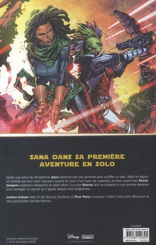 La contrebandière Sana Starros est de retour dans sa famille. Mais quand on a le passé de Sana, un simple dîner peut se transformer en une course-poursuite à travers la Galaxie ! Et c'est d'autant plus périlleux que la légendaire chasseuse de primes, Deva Lompop, est de la partie ! Sana Starros a été créée par Jason Aaron et Stuart Immonen dans les pages de la série Star Wars. Nous avons appris depuis qu'elle a été en couple avec Chelli Aphra et qu'elle a fait équipe avec Han Solo. Ce tome est l'occasion d'en apprendre davantage sur l'héroïne sous la plume de Justina Ireland (qui a écrit des romans et le manga de La Haute République) et sous les crayons de Pere Pérez (Star Wars : Revelations).