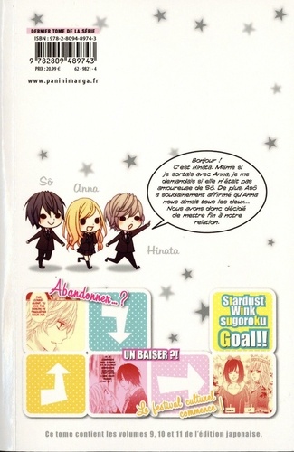 STARDUST WINK T09 : Anna peut enfin laisser libre cours à son amour avec Hinata qui revient vivre dans l'immeuble. La jeune fille devrait nager dans le bonheur mais un nuage sombre menace... Tandis que le soir du grand feu d'artifice du Obon est imminent, notre héroïne n'a jamais autant douté ! Nana Haruta continue de nous torturer... pour notre plus grand plaisir ! STARDUST WINK T10 : Hinata a retrouvé le chemin du même lycée que Anna et Sô, leurs vieilles habitudes ont donc repris et ils vont et reviennent des cours ensemble comme au bon vieux temps. Mais Ayane fait remarquer à Anna que Sô, dont elle a repoussé les avances, souffre en silence. Anna prétexte être occupée par le club de photos pour aller seule en cours. Ayane, toujours prompte à soutenir son amie, lui propose une sortie à quatre... STARDUST WINK T11 : Ayane pousse Anna à reconnaître qu'elle aime profondément ses deux précieux amis, et qu'elle est incapable de se séparer de l'un deux. Ne pouvant le nier, Anna décide de rompre avec Hinata. Quand Sô apprend leur rupture, il déclare à Anna ne plus souhaiter la fréquenter et ne plus vouloir voir Hinata. Leurs chemins se séparent... Un shojo classique mais plein d'humour, jamais à court d'événements inattendus et peuplé de personnages charmants débordant d'expressivité. Mention spéciale aux deux protagonistes masculins si attachants qu'on en redemande à peine le manga terminé !
