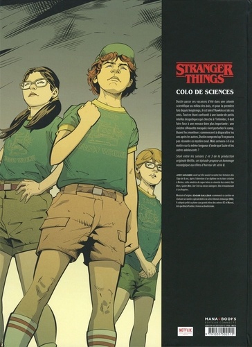 Le phénomène Stranger Things arrive chez Mana Books ! Dustin passe ses vacances d'été dans une colonie scientifique au milieu des bois, et pour la première fois depuis longtemps, il est loin d'Hawkins et de ses amis. Tout en étant confronté à une bande de petits intellos despotiques qui cherche à l'intimider, il doit faire face à une menace bien plus importante : une sinistre silhouette masquée vient perturber le camp. Quand les moniteurs commencent à disparaître les uns après les autres, Dustin comprend qu'il ne pourra pas résoudre ce mystère seul. Mais arrivera-t-il à se mettre sur la même longueur d'onde que Suzie et les autres adolescents ? Situé entre les saisons 2 et 3 de la production originale Netflix, cet épisode propose un hommage nostalgique aux films d'horreur de série B.