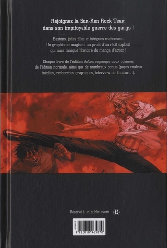 Redécouvrez la série culte de Boichi en version deluxe ! Rejoignez la Sun-Ken Rock Team dans sa spectaculaire guerre des gangs ! Bastons, jolies filles, costards de marque... Un graphisme magistral au profit d'un récit explosif qui aura marqué l'histoire du manga d'action ! Chaque livre de l'édition deluxe regroupe deux volumes de l'édition normale, dans un format plus grand, incluant de nombreux bonus (pages couleur inédites, recherches graphiques, interview de l'auteur...).