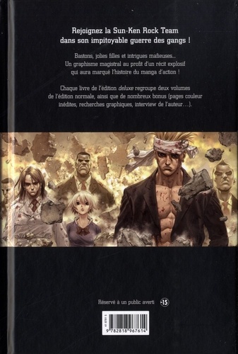 Redécouvrez la série culte de Boichi en version deluxe ! Rejoignez la Sun-Ken Rock Team dans sa spectaculaire guerre des gangs ! Bastons, jolies filles, costards de marque... Un graphisme magistral au profit d'un récit explosif qui aura marqué l'histoire du manga d'action ! Chaque livre de l'édition deluxe regroupe deux volumes de l'édition normale, dans un format plus grand, incluant de nombreux bonus (pages couleur inédites, recherches graphiques, interview de l'auteur...).