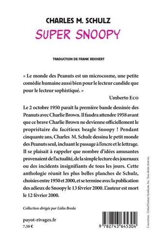 "Le monde de Peanuts est un microcosme, une petite comédie humaine aussi bien pour le lecteur candide que pour le lecteur sophistiqué". (Umberto Eco) Le 2 octobre 1950 paraît la première bande dessinée des "Peanuts" avec Charlie Brown. Il faudra attendre 1958 avant que ce brave Charlie Brown ne devienne officiellement le propriétaire du facétieux beagle Snoopy ! Pendant cinquante ans, Charles Schulz dessina le petit monde des "Peanuts" seul, incluant le passage à l'encre et le lettrage. Il se plaisait à rappeler que nombre d'idées amusantes provenaient de l'actualité, de la simple lecture des journaux ou des incidents insignifiants de tous les jours. Cette anthologie réunit les plus belles planches de Schulz, choisies entre 1950 et 2000, et se termine avec la publication des adieux de Snoopy le 13 février 2000. L'auteur est mort le 12 février 2000.